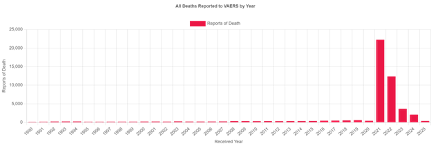 With this phrase, the lived reality that a very large number of people were experiencing, discussing, and reporting – a decline in their health following a Covid-19 vaccination – was marginalized, discredited, and even labeled as dangerous. Groups on social media that formed so people could share their stories were deplatformed under the guise of spreading “misinformation.” The CDC’s Vaccine Adverse Event Reporting System (VAERS), established in 1990 to help detect health problems that might be caused by any vaccination, mysteriously started being discredited by public health officials. And what was VAERS showing about the total number of deaths being reported each year, deaths that correlated with a vaccination?